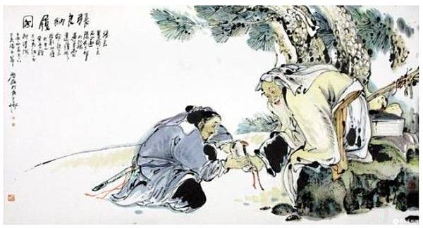 根據《史記》記載,黃石公故意把鞋丟到了橋下,叫張良下橋去取。張良再怎麼落魄,畢竟也是貴族,加上他年少氣盛,正值血氣方剛,所以很想把老人揍一頓,一解心頭之恨。但轉念一想,老人已經年邁,他實在於心不忍,就強忍心中的怒火,下橋取鞋。取上來之後,老人又命他:「你給我穿上。」於是張良就把心中的怒火一放到底,長跪於地恭敬地為老人穿上了鞋。黃石公說了一句話:「孺子可教矣。」就是說,這小子德行不錯,可以傳給他太公兵法。張良得到黃石公的教誨,日後運籌帷幄,協助劉邦建立了大漢帝國。