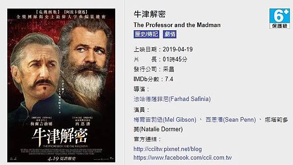 梅爾吉勃遜監製與主演,首次與西恩潘合作,卡司還有傑瑞米爾文、娜塔莉多莫。長銷經典《天才、瘋子、大字典家》震撼改編,英國百年機密檔案解密。