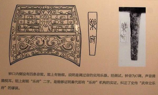 1976年,秦始皇帝陵園西側內外城垣間的飤官遺址出土青銅質,鼻形紐,有錯金蟠螭紋、流雲紋、錯銀雲紋、陽線雲雷紋飾于鐘上。 紐部刻有「樂府」二字,證明秦代已經設有樂府機構。 經測試,此鐘聲音清脆悅耳,音調準確,鐘聲屬於C調。 樂府是皇家慶典和祭司時管理音樂的官署。