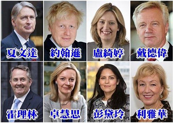 內閣中意外被委任為外相的前倫敦市長約翰遜,將接替高文浩作外務及聯邦事務政大臣;夏文達取代歐思邦成首席大臣、財政大臣;盧綺婷代替摩根擔任內政大臣;戴德偉代替賈維德出任脫歐事務大臣;霍理林替利凱輝任國際貿易大臣;卓慧思代替郝智恒任司法大臣;而彭黛玲則接替韋廷毅任國際發展大臣;而早前疑批評文翠珊沒兒女的利雅華,則獲接替維利爾斯任環境食物及鄉郊事務大臣。
