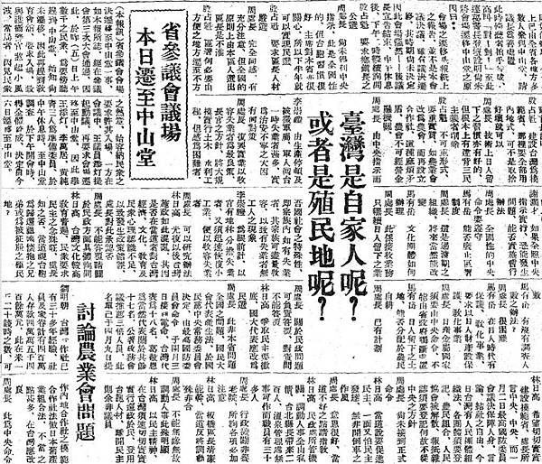 1946.5.5 林日高質詢「臺灣是自家人呢?還是殖民地呢?」 – 台灣回憶探險團 http://www.twmemory.org/?p=13883