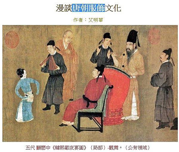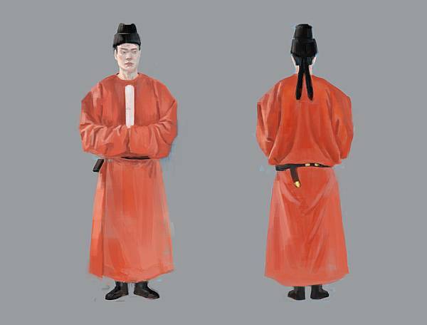 唐代官服主要服飾為圓領窄袖袍衫,其顏色曾有規定:凡三品以上官員一律用紫色;五品以上,緋為色;六品、七品為綠色;八品、九[品為青色