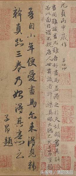 畫中自題:「吾自少年便愛畫馬,六歲得見韓干真跡三卷,乃始得其意之。」這既能說明畫家長期堅持專研,又體現其從古人身上得到精髓之「意」。 他以刻意的追求和長期的實踐,取得了高超、精湛的技藝,他曾經說:「宋人畫人物,不及唐人遠甚,予刻意學唐,殆欲盡去宋人筆墨。」而在自題中更寫到:「此圖不愧唐人」,說明他對自己這幅畫藝術成就的肯定。
