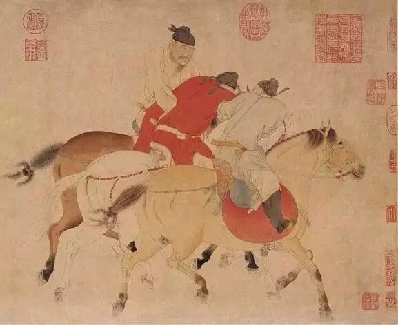 《五王醉歸圖》卷繪有五個王爺,四個侍從,九騎九乘。 開篇「何處離宮春宴罷,五馬如龍自天下。 錦韉蹀躞搖東風,不用金吾候隨駕。 」意為:時值春日,「五王」在花萼樓痛飲後,不用衞隊護侍,在溫煦東風吹拂下,乘騎搖曳而歸。 「大醉不醒危欲墮,雙擁官奴卻鞍座。 」居首穿深紅色衣服大醉、被兩個侍從攙扶者為李隆基,坐騎為「照夜白」;「彩策烏騅衣柘黃,顏赬不奈流霞漿。 」在李隆基後面的是身著淡黃衣、騎烏騅馬、表情憨厚的長兄宋王李憲。 「岐王薛王年尚少,酒力禁持美風調。 」接著是顧前盼後、騎玉花驄的岐王李范和騎黃驄驃的薛王李業;「申王伏馬思吐茵,絲繮側控勞奚人。 」需要侍從側騎服侍、伏鞍欲吐者為申王李撝,坐騎為九花虯。