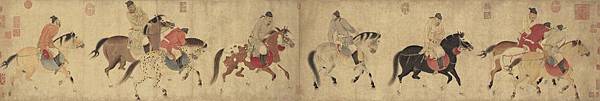 《五王醉歸圖》卷用的是宋代紙本,高三十五點五釐米,長二百一十二點五釐米。 描繪的是登基之前的唐明皇李隆基與他的四個兄弟出遊飲酒,醉後騎馬歸途中的情景。
