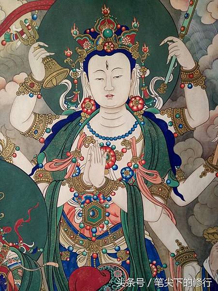 右手撚如意寶:如意寶作為轉輪王七珍之一,可以使擁有者實現一切利他的願望,會把吉祥的祝福傳遞到四面八方。在本質上,如意寶是佛陀及其教法的表現形式。