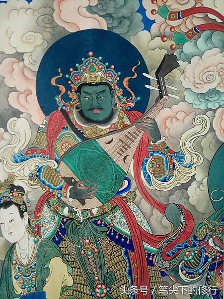 東方持國天王持琵琶,用於護持東勝神州,是主月神。表明東尊王用發音來護住眾生。其腰封為囚牛之像,囚牛乃龍之九子之長子,喜音樂。東方持國天王所持琵琶上立有囚牛的畫像。