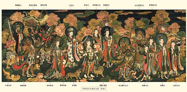 明代壁畫法海寺《帝釋梵天圖》西側:以帝釋天為首,人物由東向西排序,依次為:帝釋天、多聞天王、廣目天王、菩提樹神、大辯才天、月宮天、鬼子母、散脂大將、密跡金剛、閻摩羅王。
