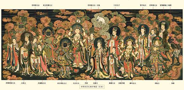 東側:繪製以大梵天為首的十尊天及侍從共十九身。依次為:大梵天與持珊瑚瓶、撐幡、捧盤三天女、持國天、增長天、大自在天及天女、功德天及天女、咒師、日天、摩利支天、地天及天女、水天、密跡金剛;