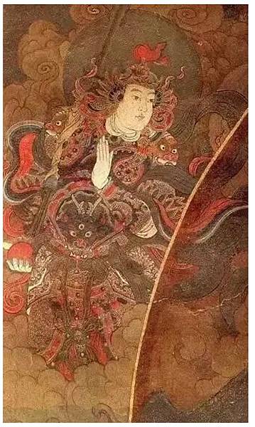 又名鬼子母象作貴婦人形象,右手持寶扇,寶扇上繪有大海浮雲、紅日白月。寶扇代表被拉長的神絲摸。