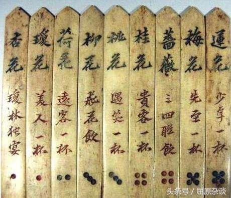 若干根簽放在籤筒裡,每根簽上畫一種花草,題一句舊詩,並附有飲酒規則,行令時一人抽籤,依簽上規則飲酒。