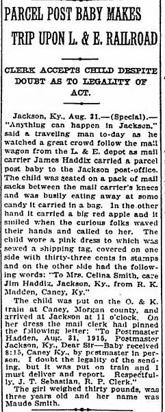 據記載,在一次郵寄兒童的事件中,三歲的莫德·史密斯被爺爺奶奶寄往肯塔基母親家的行程被辛辛那提鐵路郵件服務部總監約翰·克拉克調查,並質問肯塔基郵政局長凱尼為何允許火車郵寄孩子,斥責這種明顯違反郵政規則的行為經報紙的報導,再次引起軒然大波,從此以後,便再也沒有郵寄兒童的事件發生。