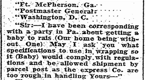 1913年1月17日的《紐約時報》就登載了一條趣聞,說的是住在賓夕法尼亞州的一位居民曾向郵政部長寫信,詢問如何包裝才可以郵寄嬰孩而不違反郵政部的規定。面對這樣古怪的問題郵政部長很頭疼,並不知道該如何回答。