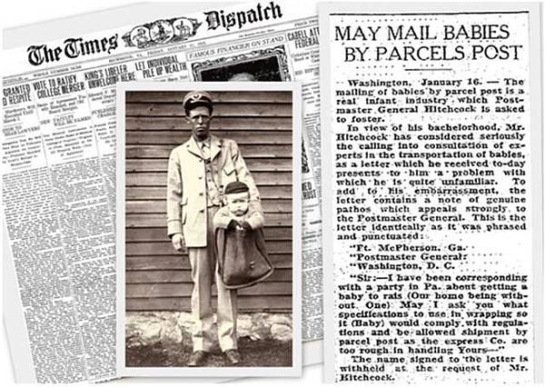 1913年1月17日,在佛吉尼亞州的Richmond的一家名為Times-Dispatch的報紙刊登了一則新聞,新聞的題目是《May Mail Babies by Parcels Post》,大意是,將來或可用郵政包裹寄寶寶啦! 而這張照片,正是當時的一張配圖。