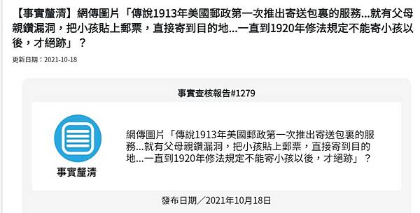 【事實釐清】網傳圖片「傳說1913年美國郵政第一次推出寄送包裏的服務…就有父母親鑽漏洞,把小孩貼上郵票,直接寄到目的地…一直到1920年修法規定不能寄小孩以後,才絕跡」? | 台灣事實查核中心