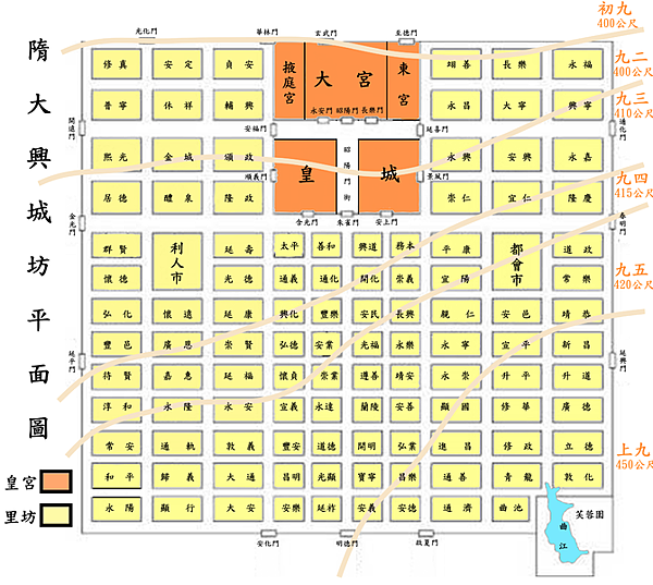 唐長安城地圖,最明顯的變化是在東北部修建了大明宮。唐玄宗在隆慶坊的舊宅,在他登基後,闢為興慶宮。