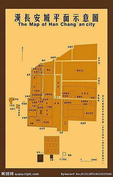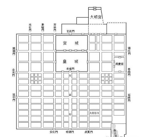 到了劉邦的兒子惠帝的時候,因為北方匈奴的威脅日益嚴重,為了加強防衛,在長安修起一圈城牆,把已有的城區都保護起來。這樣長安城便有了城牆,而這道可見的城圍又成為長安城的輪廓形狀。後世人們討論漢長安的樣子,都是就著這個形狀而大發議論的。他們所議論的長安城形狀的「深意」,是否和惠帝想的一樣,卻很難說了。 漢武帝雄才大略,朝廷也積攢了財力,於是進一步大建宮殿,先後修了桂宮、明光宮等,幾乎把城牆裡面的地面都占滿了。但還不夠,漢武帝又下令在西牆外面修建了巨大的建章宮。長安城的大建設到此算是基本結束了。今天我們在許多書上看見的漢長安城平面圖,畫的就是漢武帝時的樣子。這幅圖畫的長安城,不但劉邦、呂后沒見過,文帝、景帝也都沒見過。從劉邦的時候算起,它的建設,由幾個皇帝接力,斷斷續續九十來年。 唐長安的情況就不一樣了。唐長安城是隋朝建設起來的,當時叫大興城。那是隋文帝的時候,由將作大匠(相當於建設部總工程師)宇文凱主持規劃建設而成的。一次規劃,一次建設,一次成形,是這座城市的特點。