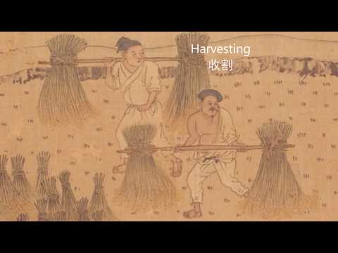 從《耕獲圖》畫面上看——起伏連綿的青山下,一條清澈的小河蜿蜒流淌,兩岸稻田像魚鱗似的,一片連著一片。 小河東岸,北面是綠樹環抱的莊園大門,門前岸邊有一架翻車,南面是一片片稻田。 小河西岸,南面是倉場,北面是一片片稻田。 在東岸稻田和西岸倉場之間,有一座小木橋。 畫面上總共有78個人物。 在莊園門前,一位老者策杖而立,悠閒自得地欣賞著田園勞動風光,這是前來視察的莊主。 在木橋東頭田埂上,有一個手持遮陽傘的人,他是督促佃客勞動的監工。 其餘的人都是佃客。 他們正在從事耕地、耙田、插秧、灌溉、築場、耘田、收割、挑禾、上架、脫粒、簸揚、舂米、入倉、堆秸等不同的勞動。 畫家描繪的是一座江南地主田莊生產勞動的場面,重點反映了種植水稻的佃客從耕田到收穫的全過程。 《耕獲圖》具有極高的史料價值,是瞭解宋代江南農業生產狀況難得的形象材料。《耕获图页》杨威_宋画大全_宋画数字博物馆 http://bit.ly/2PTBCQ9