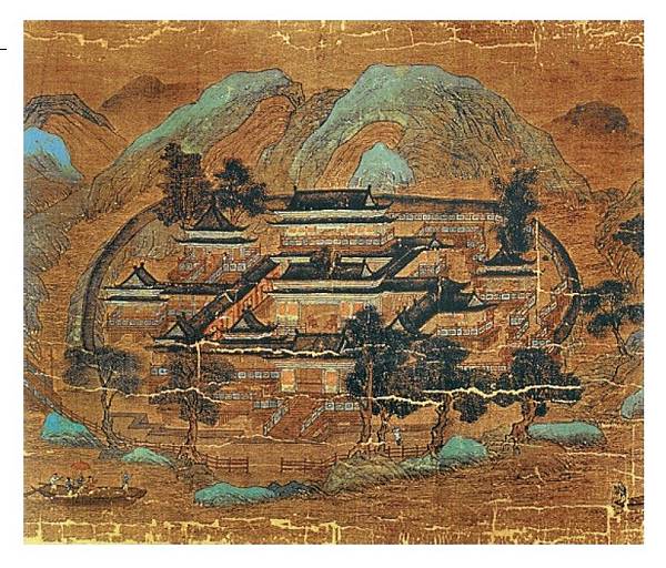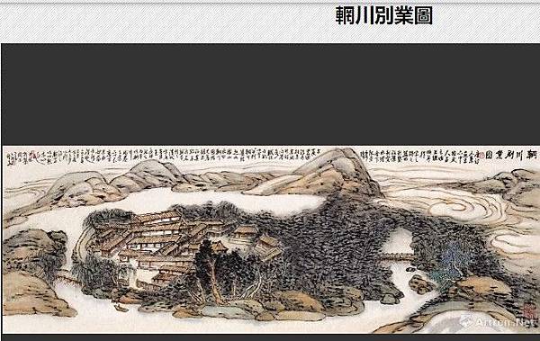 輞川圖,王維唐代詩人、畫家(701-761)晚年隱居輞川時所作。畫面群山環抱,樹林掩映,亭台樓榭,古樸端莊。別墅外,雲水流肆,偶有舟楫過往, 呈現出悠然超塵絕俗的意境。