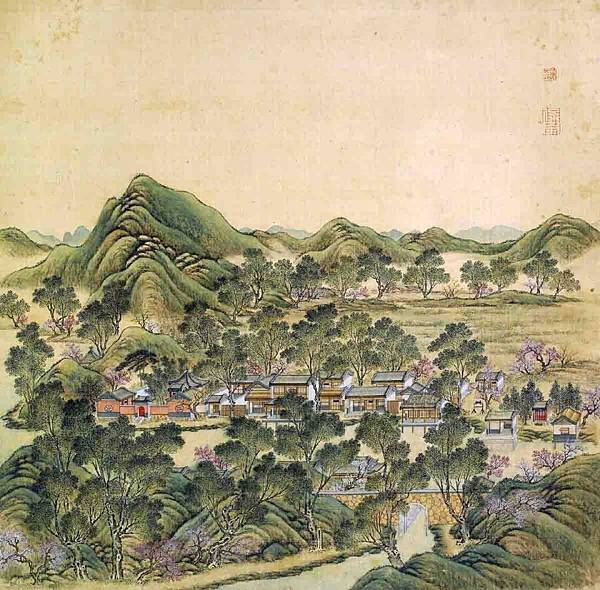 乾隆九年御製「北遠山村」詩序曰:循苑牆度北關,村落鱗次,竹籬茅舍,巷陌交通。平疇遠風,有牧笛漁歌與舂杵應答。讀王儲田家詩時遇此境。詩云:「矮屋幾楹漁舍,疏籬一帶農家。獨速畦邊秧馬,更番岸上水車。牧童牛背村笛,饁婦釵梁野花。輞川圖昔曾見,摩詰信不我遐」。又詩句云:「雨後偷閒試泛舟,桃李清溪穿一帶」。榆葉杏花交隱映,青蒲白芷碧溪灣。「春闌曲岸霏紅雪,雨歇遙岑濯綠鬟。蓑笠農人浸種去,鉤筐婦女採桑還」。