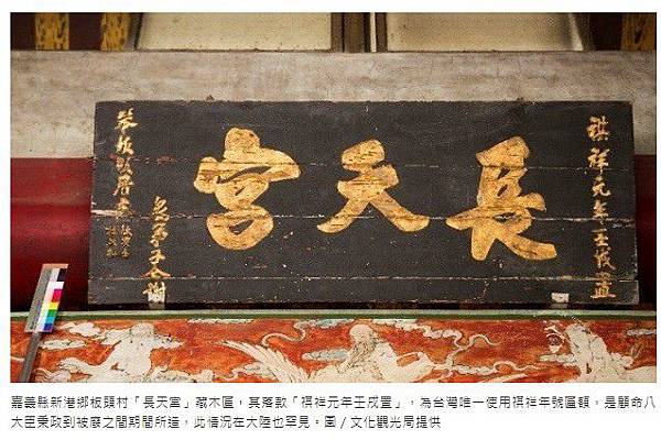 嘉義縣新港鄉板頭村「長天宮」藏木匾,其落款「祺祥元年壬戌置」,為台灣唯一使用祺祥...