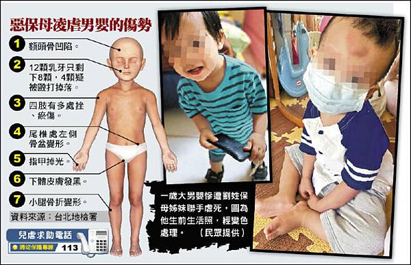 〔記者林南谷/台北報導〕北市一名1歲男嬰去年12月因噎奶送醫不治身亡,檢警相驗發現男嬰除左側骨盆變形及額頭骨凹陷外,全身還有大小身痕,牙齒也斷4顆,認為男嬰遭劉姓保母施暴,羈押後追查出劉女妹妹也涉案,2人依妨害幼童發育、過失致死、妨害自由罪嫌及兒童及少年福利與權益保障法送辦。