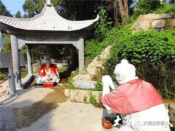 谷內一山巔,形如一幅巨大的姜太公石雕,只見他昂首闊挺胸,面北而立,身著道袍,後背文卷,長須飄胸,躊躕滿志,一幅仙風道骨,濟世救民的政治家、 軍事家的威武形象惟妙惟肖,令人歎為觀止!