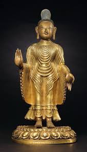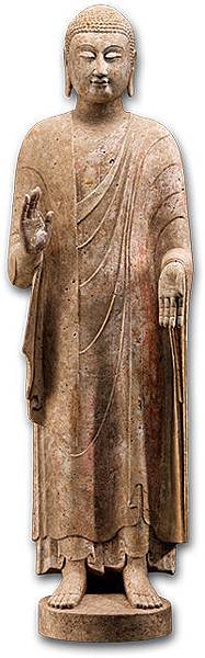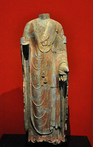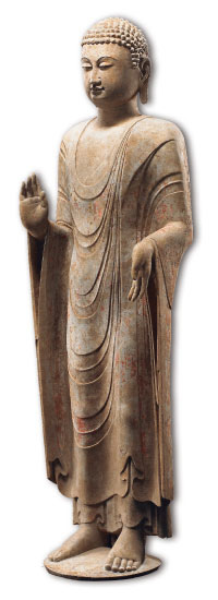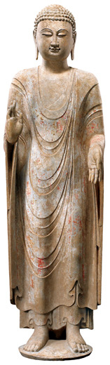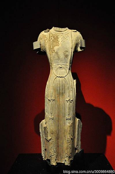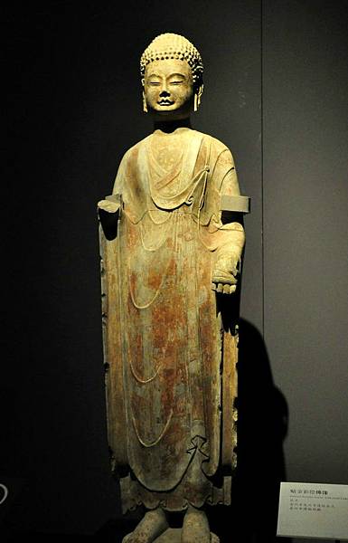 北齐时期,中原受鲜卑文化的影响,造像的体形由秀骨清像转向丰圆,亦受到印度笈多式风格影响,佛衣趋于单薄,佛衣下摆由外展变得内敛,佛衣右领襟由传统的褒衣博带敷搭左肘上,移至左肩。中台世界博物馆 http://bit.ly/2Hn50KN