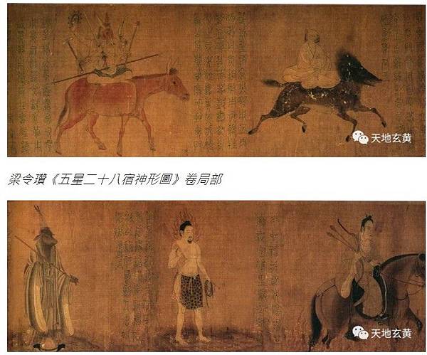 在《圖繪寶鑑補遺》中,也把這卷畫定為梁令瓚畫:梁令瓚,或日蜀人,開元中工畫人物。宋秘閣有《五星二十八宿真形圖》一卷,李伯時雲「甚似吳生」。