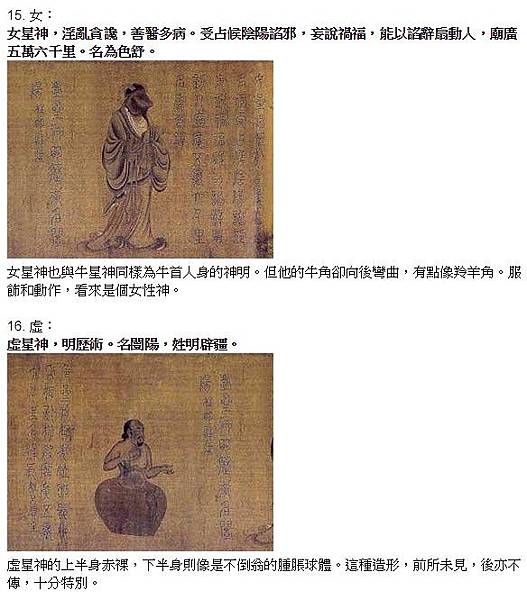 第十五幅女星記:「女星神,淫亂貪讒,善醫多病。受占候陰陽諂邪,妄說禍福,能以諂辭扇動人,廟廣五萬六千里。名為色舒。」