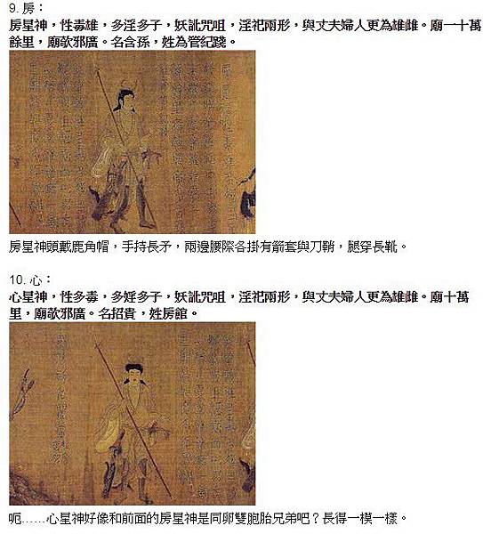 第十幅心星記:「心星神,性多毒,多婬多子,妖訛咒咀,淫祀兩形,與丈夫婦人更為雄雌。廟十萬里,廟欹邪廣。名招貴,姓房館。」