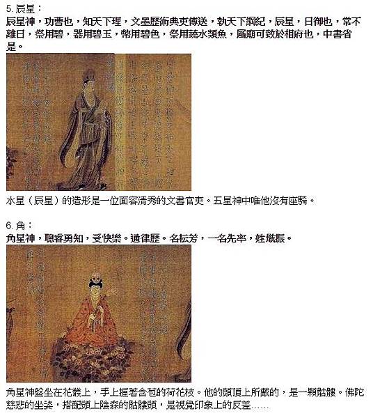 第五幅辰星記:「辰星神,功曹也,知天下理,文墨歷術典吏傳送,執天下綱紀,辰星,日御也,常不離日,祭用碧,器用碧玉,幣用碧色,祭用蔬水類魚,屬廟可致於相府也,中書省是。」