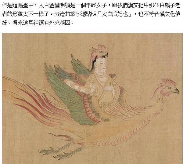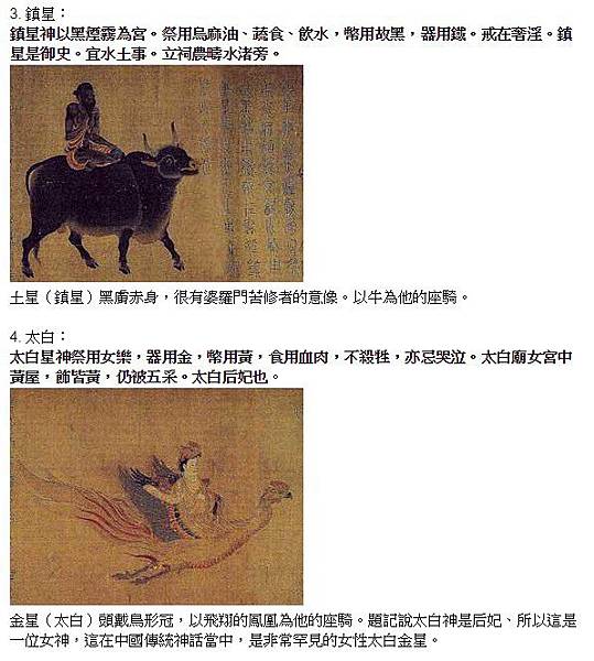 第四幅太白星記:「太白星神祭用女樂,器用金,幣用黃,食用血肉,不殺牲,亦忌哭泣。太白廟女宮中黃屋,飾皆黃,仍被五采。太白后妃也。」