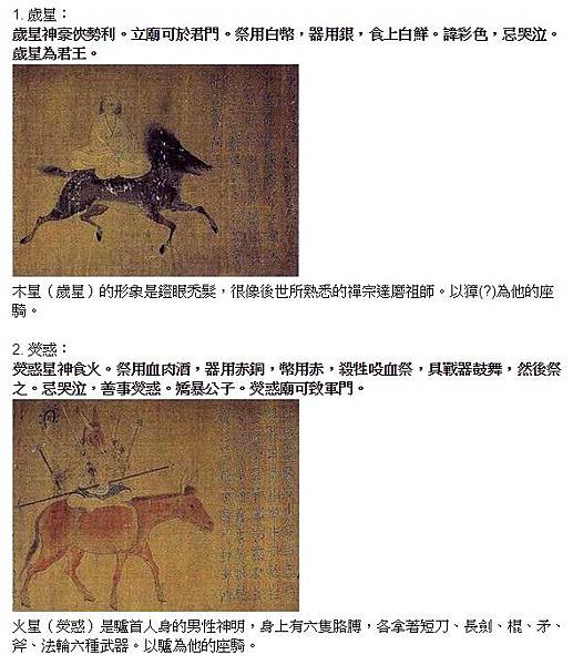 第一幅歲星記:「歲星神豪俠勢利。立廟可於君門。祭用白幣,器用銀,食上白鮮。諱彩色,忌哭泣。歲星為君王。」