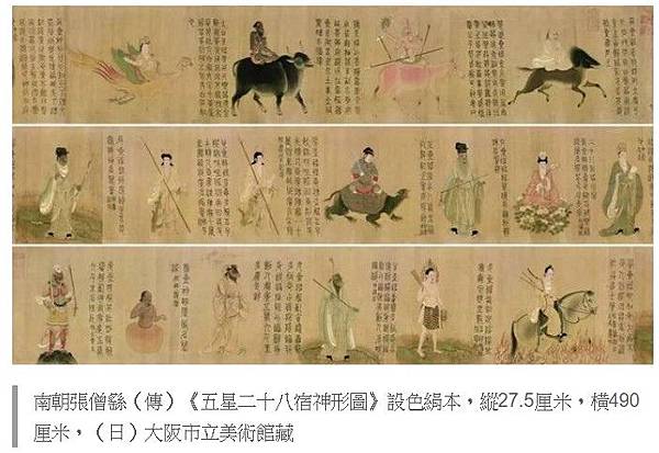 最近見到令我「嚇」了一跳的圖,是由南朝梁(公元六世紀)的畫家「張僧繇」所繪的一幅橫軸長圖,名字為《五星二十八宿神形圖》,是將古中國的各個「星神」,賦予擬人化的形象。圖像精美,簡直是「神品之作」!
