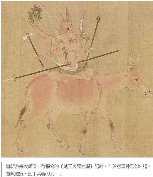 行年至此星。一名南方熒惑星。一名四利星。一名虛漢。其星周迴七十里。屬魏國之分。若臨人命。必生口舌。疾病相纏。⭐神形如外道。首戴驢冠。四手兵器刀刃⭐。國王以仲夏之月。用火祭之。行年至此者。君子臨福。職事進益。小人臨福。災害不生。敬之即無殃咎。人命屬雲霄。天神相保。不敢蘖禍。錢財滿盈。福祿廣至。雖有少憂。自解無苦。《梵天火羅九曜》