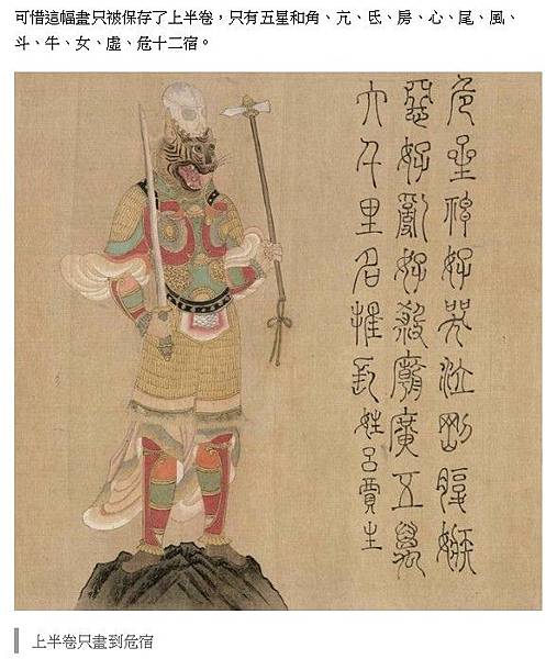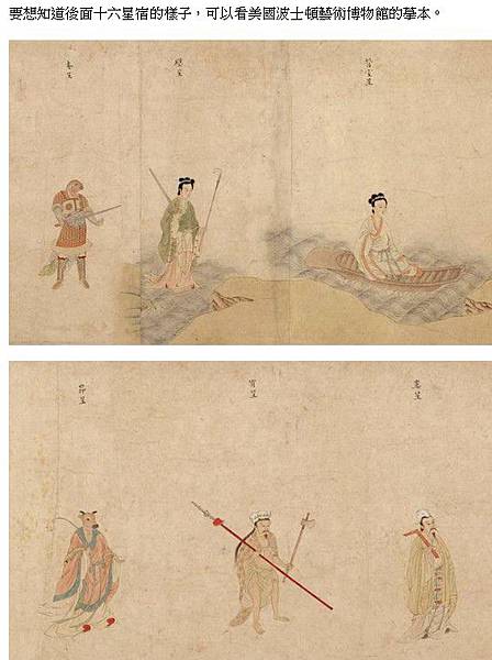 只可惜今日流傳下來的作品中,五星廿八宿(共卅三幅神像),目前僅剩前半的十七幅而已。五星與東方青龍七宿是完整的,北方玄武有前五宿星神,至於玄武後二神以及西方白虎、南方朱雀全都不見了(或者說,張僧繇根本就沒畫完……?)。