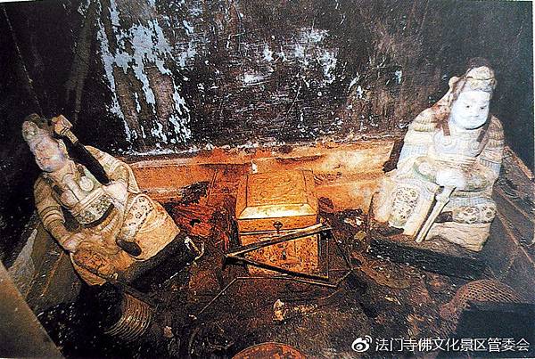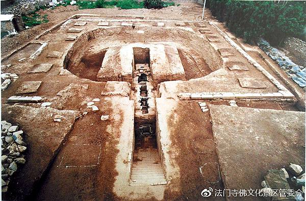 1987年4月,封閉一千多年的神秘地宮之門被打開,裏邊金碧輝煌,千年古物熠熠放光。經測量,地宮長21.21米,面積31.84平方米,是國內迄今發現的佛塔地宮中最大的一個。地宮基石皆雕成仰蓮瓣形,取塔建於蓮座之上。地宮共有四道門,門上雕有天王護法像、蓮花等,色彩鮮豔。門楣上繪有姿態各異的瑞鳥朱雀。前室發現了《大唐鹹通啟送歧陽真身志文碑》和《監送真身使隨負供養道具及恩賜金銀器衣物帳碑》,這兩通碑不僅是研究法門寺 歷史,而且是研究唐朝佛教的重要資料。