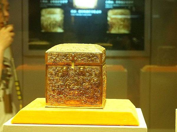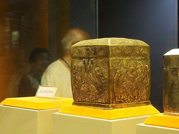 從地宮發掘了四枚佛指骨舍利,一枚置於嘉陵頻伽紋壺門座銀棺中,一枚置於雙鳳寶蓋紋銀棺中,還有一枚置於唐懿宗供奉的八重寶函中。這是套裝的八重寶函,從裏向外第一重是寶珠頂單簷四門純金塔,塔庭銀柱上套置佛骨舍利。發掘的真身舍利“秘藏”于一普通的鐵函裏。打開鐵函,裏邊是盝頂銀函,上有45尊造像和“奉為皇帝敬造釋迦牟尼佛真身寶函“的鏨刻,再裏層是銀包角檀香木函,木函內放置著一具嵌寶水晶槨,真身佛指就安放在槨內的壺門座玉棺中。地宮出土的佛指舍利,是世界上目前經過考古科學發掘,有文獻和碑文證實的釋迦牟尼真身舍利,是當今佛教界的最高聖物。