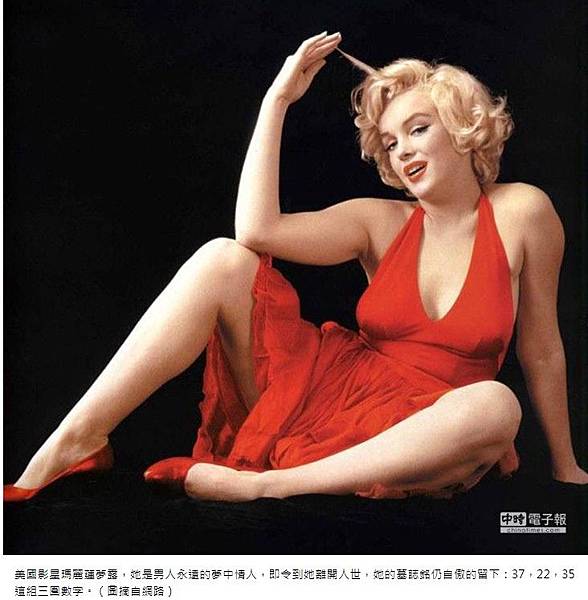 美國影星瑪麗蓮夢露,她是男人永遠的夢中情人,即令到她離開人世,她的墓誌銘仍自傲的留下:37,22,35這組三圍數字。(圖摘自網路)