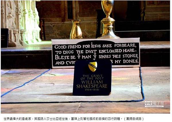 世界最偉大的戲劇家,英國詩人莎士比亞逝世後,墓碑上刻著他臨終前自撰的四行詩體。(圖摘自網路)