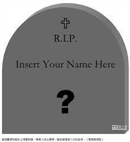 這塊墓碑在設計上相當詼諧,某某人在此長眠,請在這裡填入你的姓名。(圖摘自網路)