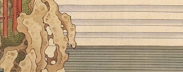 第八圖,淤蔭。在空間處理上,也把人物放在一個真實的空間中,以人物為中心營造空間,建築大小也考慮到人的尺度,甚至不惜犧牲建築空間的完整性。