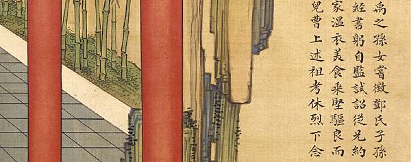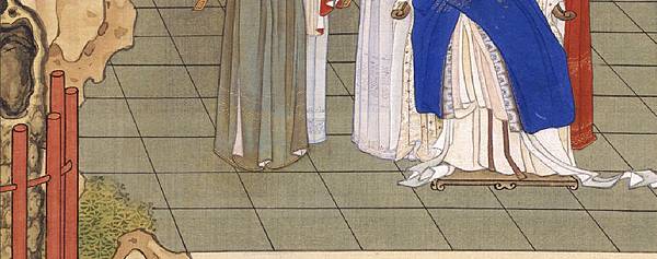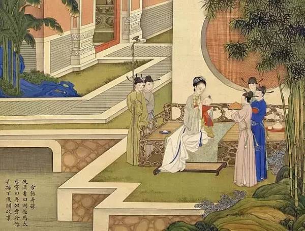 《歷朝賢后故事圖》圖冊,清,焦秉貞繪,絹本,設色,12開,每開縱30.8cm,橫37.4cm。 歷史故事是清代宮廷繪畫中的重要題材之一。此套圖冊題材取自歷代有良好德行的皇后、太后的故事,在12開的冊頁中,所繪仕女形象柔弱,設色濃艷,富有裝飾性。圖上建築物的繪製採用歐洲焦點透視的方法,有別於中國的傳統界畫。每開對題是由梁詩正書寫的弘曆在皇子時期所作的詩句,記錄了這些皇后、太后的事跡和對她們的評價。