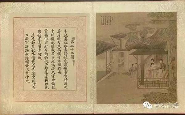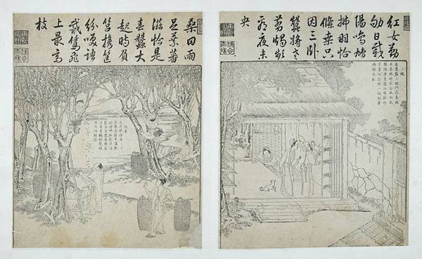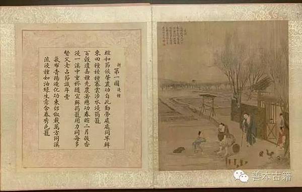 《耕織圖》不但版本眾多,版式等也不盡相同,如上文下圖本,左圖右文本,版框帶有龍紋的裝飾本,袖珍刻本,木刻填色本,書中序文、詩文前後璽印朱色鈐印本,前後璽印為刊版墨印本等