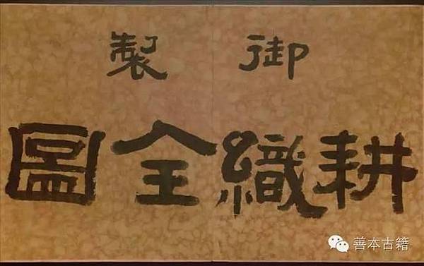 【《御製耕織圖》】 《御製耕織圖》又名《佩文齋耕織圖》,不分卷,清聖祖玄燁題詩,焦秉貞繪圖,朱圭、梅玉鳳鐫刻,清康熙三十五年(1696年)內府刊本。耕圖、織圖各23幅,共計46幅圖。每頁34.7cm×27.7cm。圖框24.4cm×24.4cm。四周單邊。冊頁裝。 《耕織圖》以江南農村生產為題材,系統地描繪了糧食生產從浸種到入倉,蠶桑生產從浴蠶到剪帛的具體操作過程,每圖配有康熙皇帝御題七言詩一首,以表述其對農夫織女寒苦生活的感念。 《耕織圖》是中國農桑生產最早的成套圖像資料,它的繪寫淵源可上溯至南宋,繪者為樓璹。樓璹在宋高宗時期任於潛(今浙江省臨安市)縣令時,深感農夫、蠶婦之辛苦,即作耕、織二圖詩來描繪農桑生產的各個環節。 《耕織圖》成為後人研究宋代農業生產技術最珍貴的形象資料。南宋嘉定三年(1210年),樓璹之孫樓洪、樓深等以石刻之傳於後世,南宋理熙元年(1237年)有汪綱木刻複製本。宋以後關於本書的記載已不多見,較著名的有南宋劉松年編繪的《耕織圖》,元代程棨的《耕織圖》45幅。明代初年編輯的《永樂大典》曾收《耕織圖》,已失傳。明天順六年(1462年)有仿刻宋刻之摹本,雖失傳,但日本延寶四年(1676年)京都狩野永納曾據此版翻刻,今均以狩野永納本《耕織圖》作樓璹本《耕織圖》之代表。 清康熙二十八年(1689年)康熙帝南巡時,江南士子進獻藏書甚豐,其中有“宋公重加考訂,諸梓以傳”的《耕織圖》。康熙帝即命焦秉貞據原意另繪耕圖、織圖各23幅,並附有皇帝本人的七言絕句及序文。繪畫內容略有變動,耕圖增加“初秧”、“祭神”二圖,織圖刪去“下蠶”、“餵蠶”、“一眠”三圖,增加“染色”、“成衣”二圖,圖序亦有變換。宋、清《耕織圖》的佈景與人物活動大同小異,但焦圖畫中的風俗易為清代,所繪更為工細纖麗,在技法上還參用了西洋焦點透視法。 《耕織圖》初印於康熙三十五年(1696年),後又出現了很多不同版本,木刻本、繪本、石刻本、墨本、石印本均行於世。如康熙年間的康熙三十八年(1699年)張鵬翮刻本,康熙五十一年(1712年)內府刻本,雍親王胤禛絹底彩繪本,康熙五十三年(1714年)歙縣汪希古恭摹刻48塊墨板,宮廷繪白描本等,乾隆年間的康熙、雍正、乾隆三帝題詩刊本,清內府刻《授時通考》本,袖珍彩繪本,乾隆四年(1739年)清內府圖為木刻、詩為石刻的經折裝本,乾隆三十四年(1769年)北京刻朱墨套印本,楊大章彩繪本,乾隆三十四年(1769年)高宗命畫院據元代程棨本臨摹之《耕織圖》,石刻嵌在皇家清漪園延賞齋左右廊壁的拓本,乾隆三十五年(1770年)徽州守臣摹刻的墨版。此外,還有嘉慶十三年(1808年)《耕織圖詩》補刊本,同治十一年(1872年)刊本,光緒五年(1879年)上海點石齋《御製耕織圖》石印本,光緒十一年(1885年)上海文瑞樓本,光緒十二年(1886年)上海點石齋石印本。民國時期也有多種版本,較著名的為武進陶蘭泉刊本;日本、朝鮮、琉球等國亦有《耕織圖》的摹本、翻刻本。 《耕織圖》不但版本眾多,版式等也不盡相同,如上文下圖本,左圖右文本,版框帶有龍紋的裝飾本,袖珍刻本,木刻填色本,書中序文、詩文前後璽印朱色鈐印本,前後璽印為刊版墨印本等。