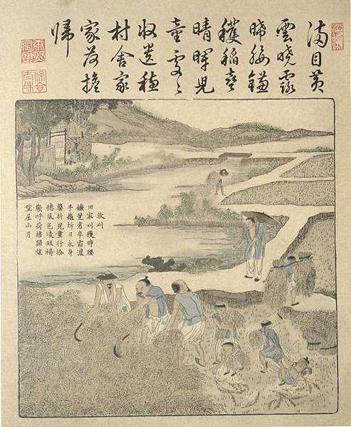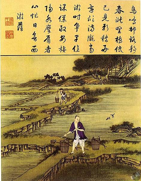 清朝宮廷畫家焦秉貞,奉康熙皇帝之令,將宋版的《耕織圖》重新繪製成彩色版的《御製耕織圖》46幅。每幅上方都有康熙帝的題句,鏤版印賜諸臣。隨後在民間廣為流傳。以下為該圖冊的前半段,耕圖23幅 清康熙版《耕織圖》︰耕圖 http://www.newsancai.com/?p=188211