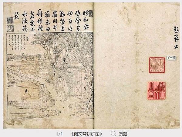 (一)、最早的耕織圖是由南宋初期的樓瓙所繪。樓瓙在南宋任於潛縣令(今臨安)時,「深領帝旨」,篤意民事,概念農夫蠶婦之作苦,究防始末,為『耕』、『織』二圖。