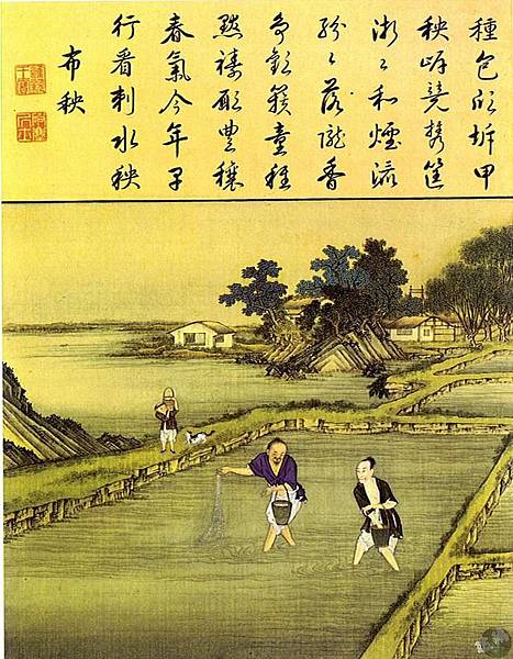 (9)、陳枚《耕織圖》 陳枚字殿論、號載東,乾隆年間供奉於宮廷畫院,受乾隆皇帝之命,也參照焦秉貞《耕織圖》重新繪製了著彩《耕織圖》一套,筆法也有些摹仿雍正帝命繪之圖本,每圖配乾隆帝題詩一首,所配之詩是乾隆帝年輕時的舊作。乾隆皇帝還為之寫了後記。1985年12月日本渡部武先生在台灣故宮博物院見到此圖。