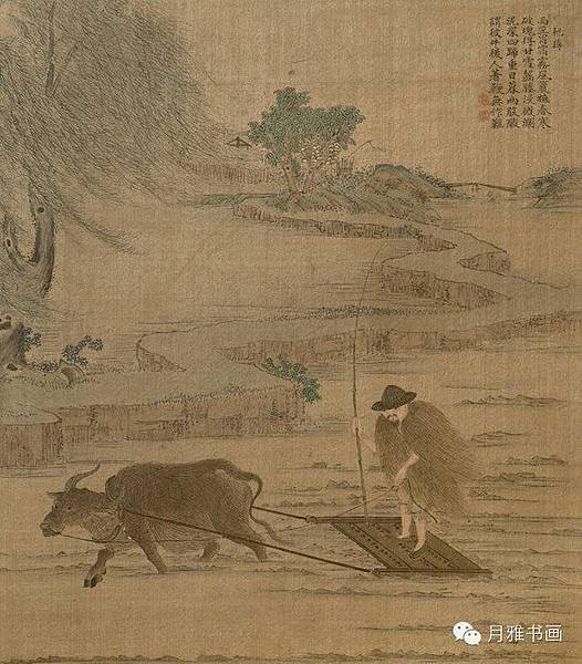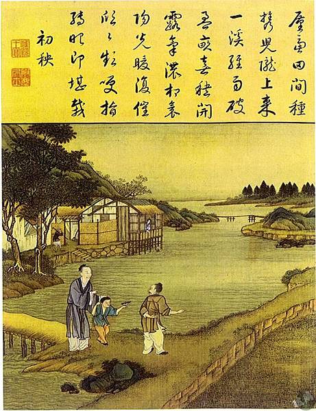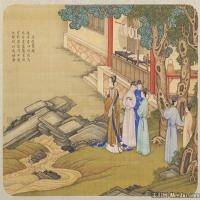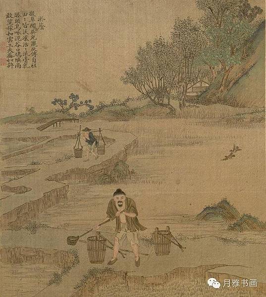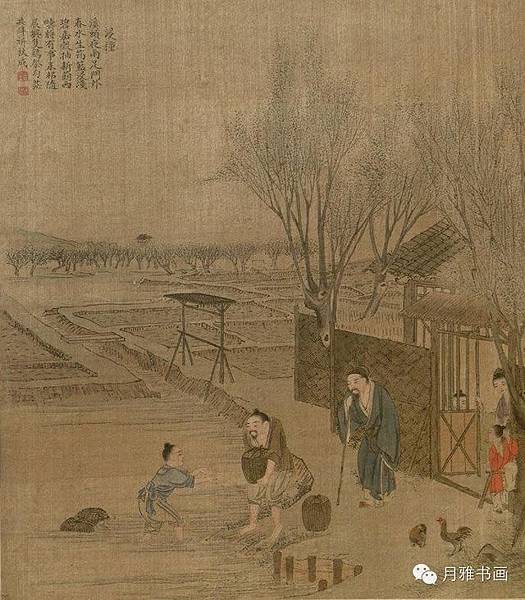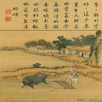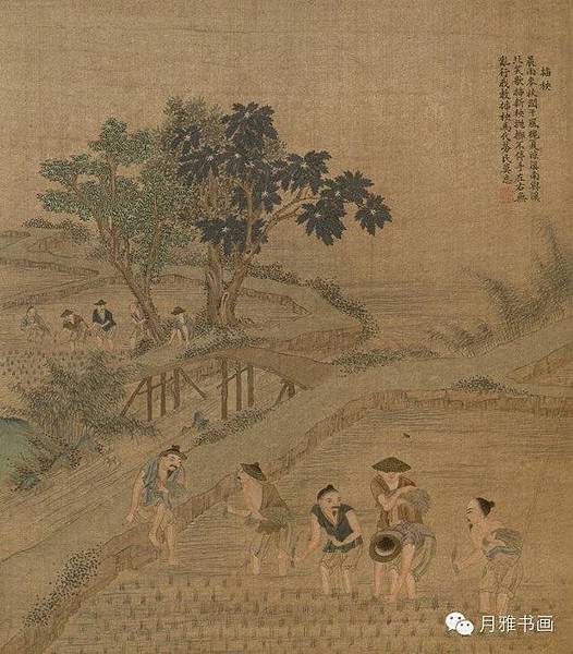(10)、冷枚《耕織圖》 和陳枚同時供職於宮廷畫院的畫家冷枚,字吉臣,也繪製過《耕織圖》,其畫法與陳枚基本相同。此圖上方影錄了康熙皇帝為焦秉貞《耕織圖》的配詩。冷枚《耕織圖》現收藏於台北故宮博物院。